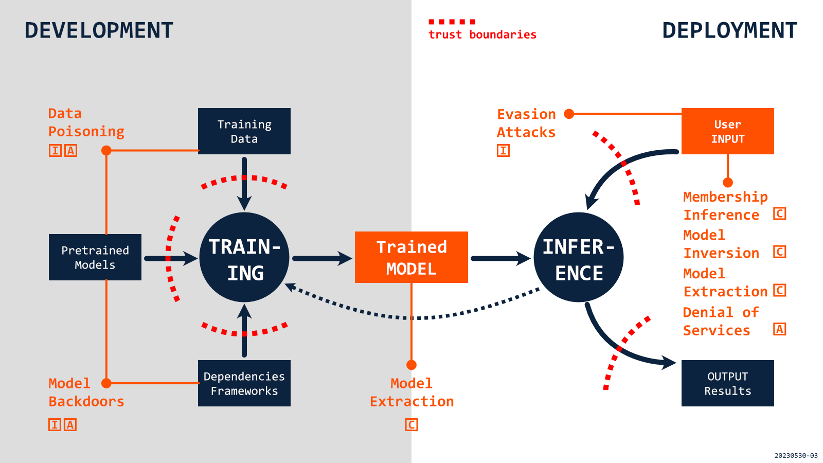 The attacks against the AI models are often referred to as adversarial-machine-learning. They can have different practical goals (again, very context-dependent), but in most cases, they are aimed at extracting value from the system, altering its behavior, or completely disrupting its operations. Even if the details and context of the threats may be new and unique, these general categories should be familiar, as they translate to fundamental security properties of Confidentiality, Integrity, and Availability. In the scope of each of these properties, though, some new elements require closer attention.
