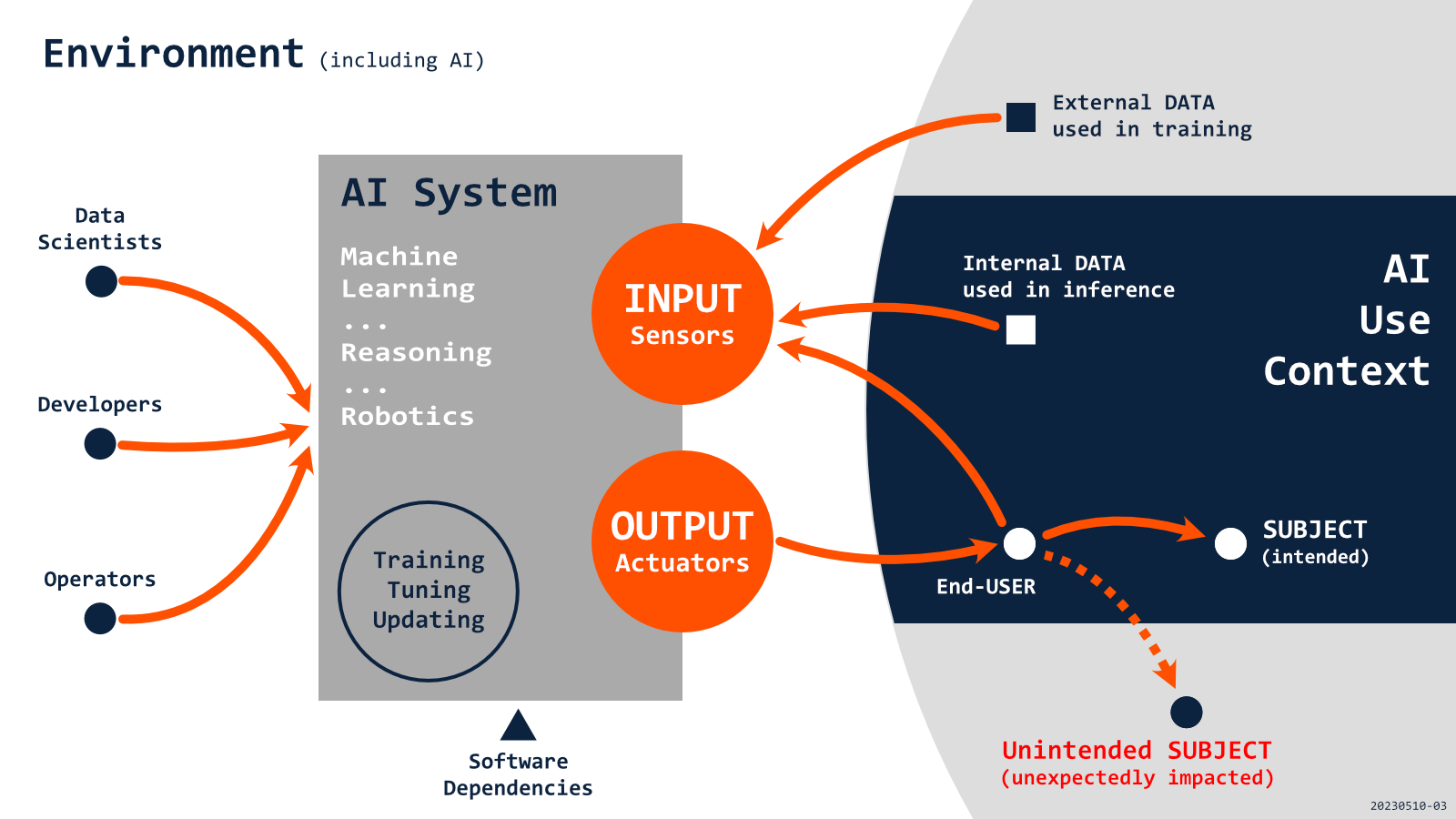 AI USE CONTEXT includes all elements, actors, and aspects of the environment that are relevant or can be affected by decisions or tasks that we try to automate or augment with help from AI. Given the variety of new applications and growing technical capabilities, creating a definition of a context for all emerging scenarios can be tricky (since it can be, well, contextual). We are dealing with complex systems that we don’t fully understand. There are differences in USE CONTEXTs for systems that generate a logo, are expected to drive a car, or should assist a physician in a medical diagnosis. Even in the scope of the same application, we might talk about multiple contexts depending on the point of view. Different elements will be relevant for an individual who is enabled by AI capabilities, a startup trying to build a business by automating specific tasks, and employees whose jobs get automated.