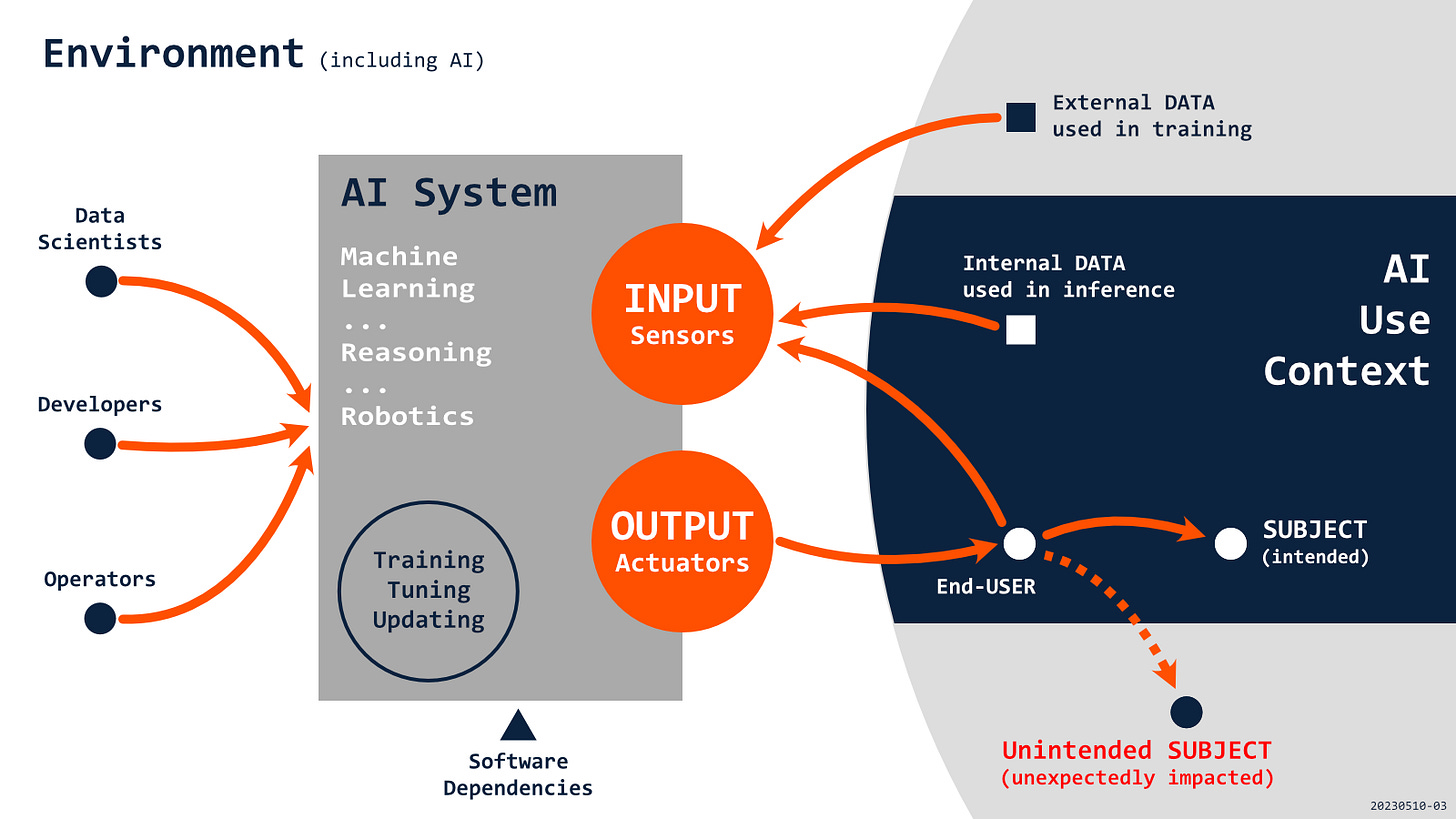 That said, with AI applications, we still have a responsibility to identify core elements and aspects of USE CONTEXT that can relate to all possible negative effects of the technology, assuming worst-case scenarios. We need to determine what can go wrong, under what circumstances harm could be caused, and who might be affected. When an AI application is used in an environment (and is usually also a part of it), its impact can be broad and often unexpected. In all non-trivial scenarios, we should look at AI applications as socio-technical systems that include technology, environment, and users but can also have unintended impacts in the individual, business, social, or global scope.